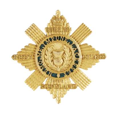 the gilt metal star and cross inscribed to arms Queens Body Guard of Scotland, the centre with displayed thistle surrounded by green enamel border with motto 'NEMO ME IMPUNE LACSSET'