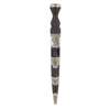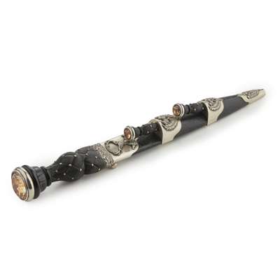 the carved black wood handle with basket weave decoration and collet set foil backed crystal to pommel, the tapered blade with knotched back edge and double fuller, the leather covered scabbard with thistle applied mounts with chape and bi knife and fork the top mount with regiment badge