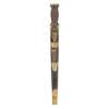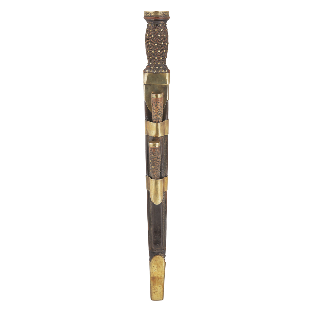 the carved wooden handle with basket weave and brass studded decoration the pommel set with simple brass cap, with single fuller blade, the leather scabbard with simple shaped brass mount s set with bi knife and fork
