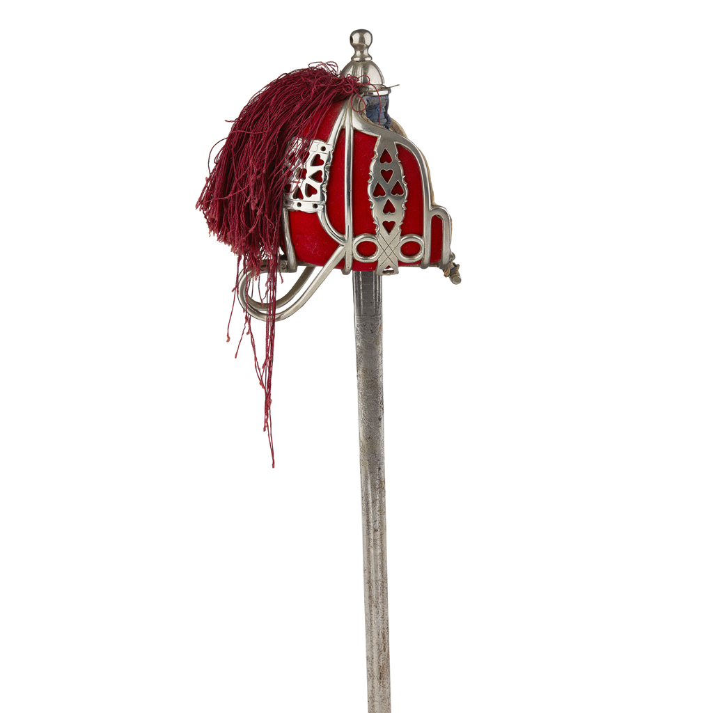signed to the blade, the blade etched with regimental badges, Royal cypher and crests etc., the conventional basket hilt with heart and ring piercing and red felt lining