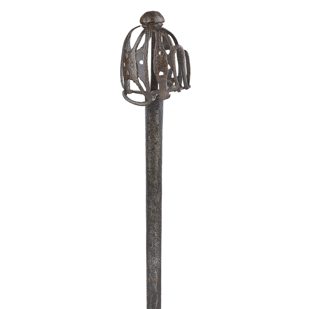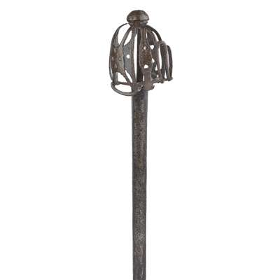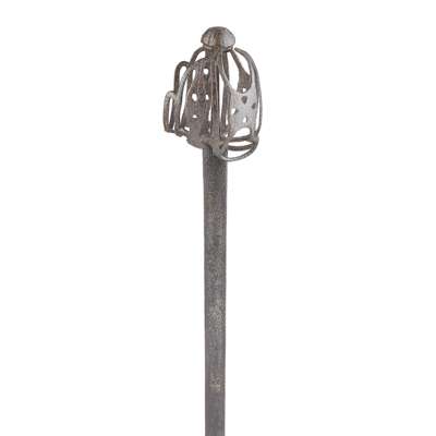 the conventional basket formed of flattened curved bars, pierced scalloped and heart decorated panels, with compressed pommel, the blade indistinctly signed ANDREA FERRARA
