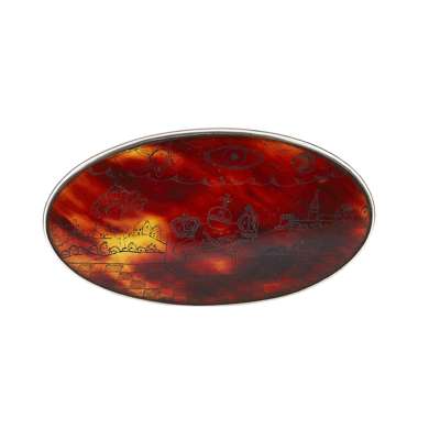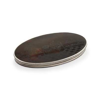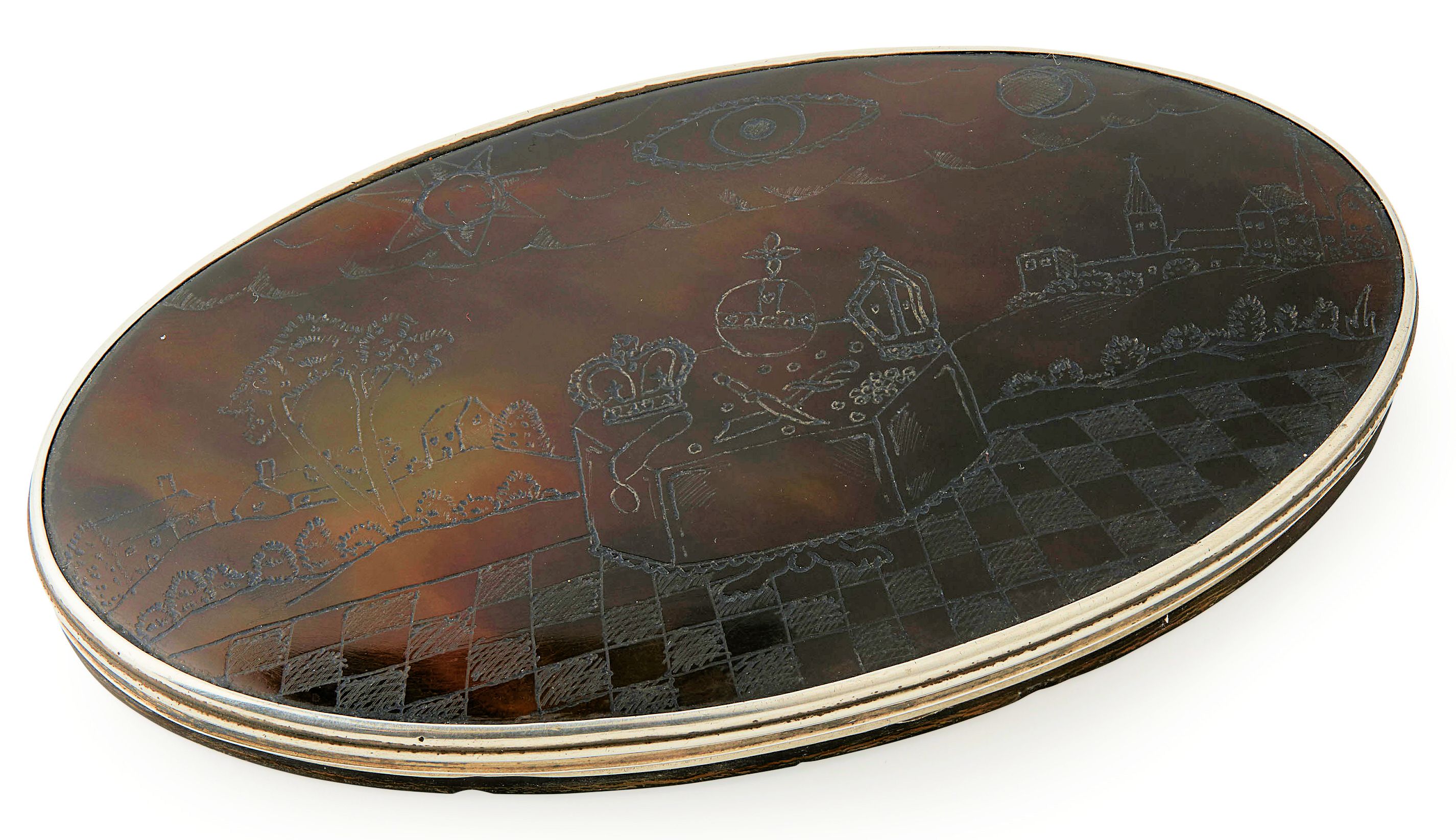 unmarked, plain silver moulded rims to lid and base, plain tortoiseshell base, the slightly rounded lid with delicately engraved landscape, with a tiled floor, table with crown jewels and a mitre, the sky with sun moon and eye