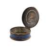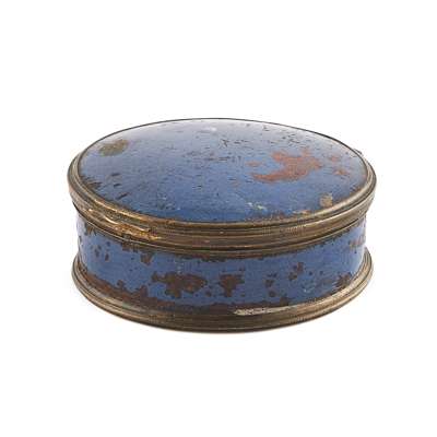 of circular outline, the deep blue enamel ground with gilt brass mount and hinged cover, the base of the interior zinc lined, the lid of black ground with oval applied portrait of Prince Charles Edward Stuart within gold border; sold with an accompanying note stating ''This box was presented by Prince Charles Edward to Captain John Burnett of the R. H. Arty'