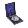 unmarked, the large shield medallion with finely engraved foliate scrolls and zig zag border with a heraldic shield cartouche, engraved armorial of the Royal Burgh of Cupar and inscribed 'Presented by Town Council June 1889' the reverse similarly formed with engraved shield 'Gained by Nellie Cooper Upper English Department Madras Academy' the whole central section within finely cast foliate scroll frame with cherub surmount, in fitted case of issue inscribed T.L. Brown successor to D. Duncan & Son Jeweller & Watchmaker
