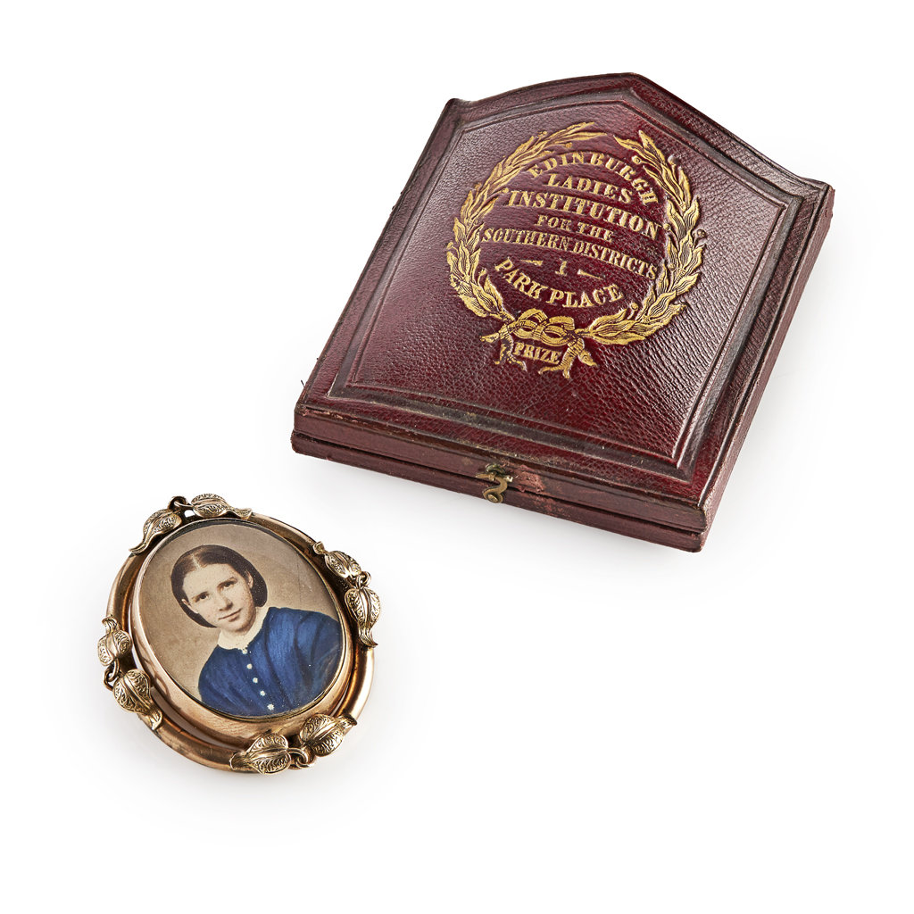unmarked, the oval photographic portrait under glazed panel surrounded by yellow metal frame with leaf clasped details, the reverse engraved 'The Edinburgh Ladies Institution 1 Park Place Established 1833' around a central presentation inscription 'Institution Gold Brooch presented to Eliza Griffith the most distinguished pupil completing a course of study July 1862', in fitted case inscribed MacKay & Chisolm, Edinburgh, and with gilt naming to exterior