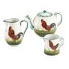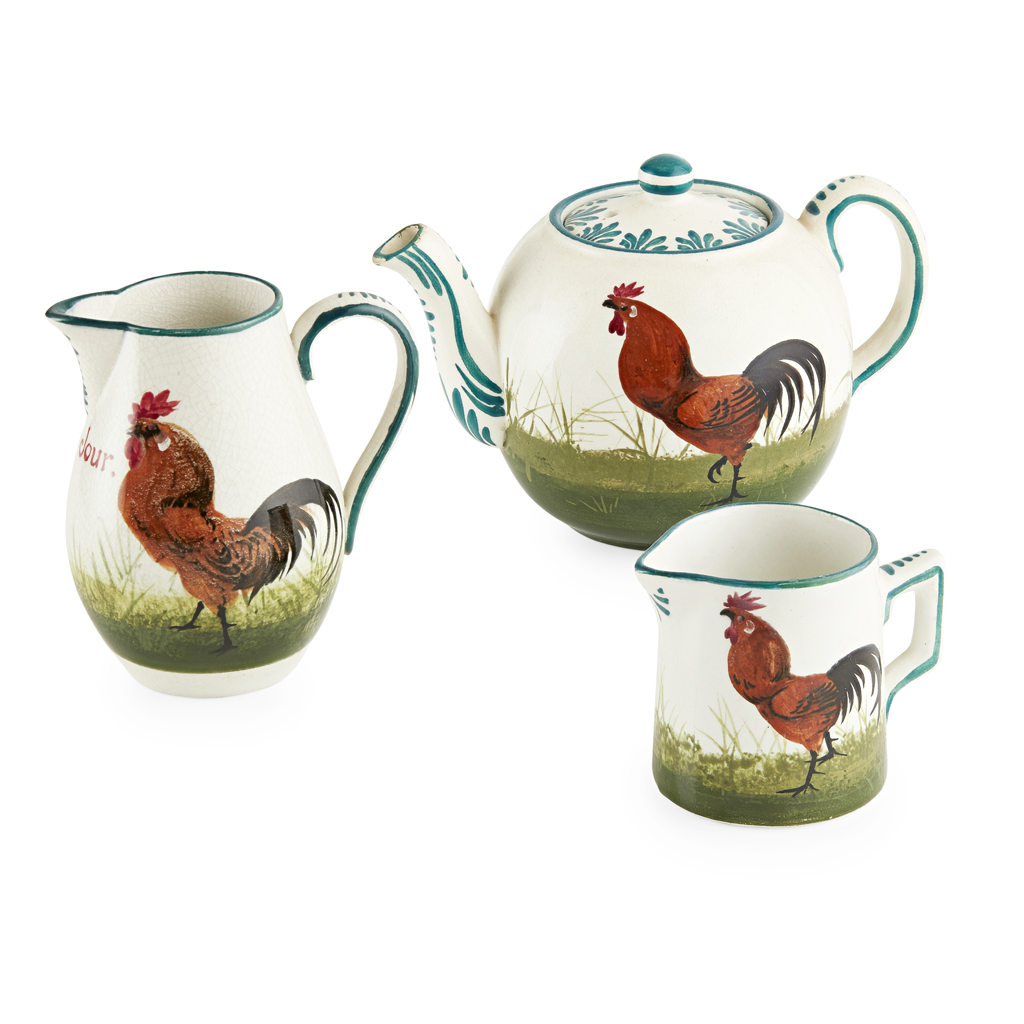 comprising a TEAPOT & COVER, painted maker's mark WEMYSS, 10cm high; a MILK JUG, bearing inscription BONJOUR, impressed maker's mark WEMYSS, printed retailer's mark, 11cm high; and another smaller MILK JUG, 6.5cm high, painted maker's mark WEMYSS, restored (3)