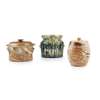comprising a MARBLED JAR & COVER, 14cm high; a MARBLED SUGAR JAR, with later wooden cover, bearing inscription BE CANNY/ WITH THE/ SUGAR/ 1893, 15cm high; and a ROSSLYN POTTERY BUTTER JAR & COVER, covered with splatter glazes, 15cm high (3)