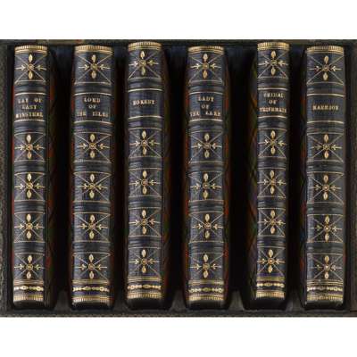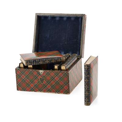 the rectangular box covered in Prince Charlie tartan paper, enclosing 'Poetical Works'. Edinburgh: A. & C. Black, [not dated but circa 1870] 6 volumes, 16mo, 'Select edition', each bound in black quarter morocco gilt with Tartan Ware covers (Prince Charlie, Stuart x 2; McLean; McBeth & McPherson), clasp broken, paper chipped from box, a little internal damp-staining and foxing to books