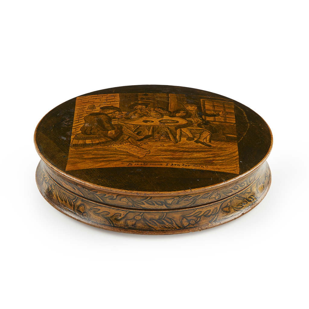 of circular form, the cover painted with a tavern scene and inscribed "IT IS THE MOON I KEN HER HORN", the base painted with THISTLES