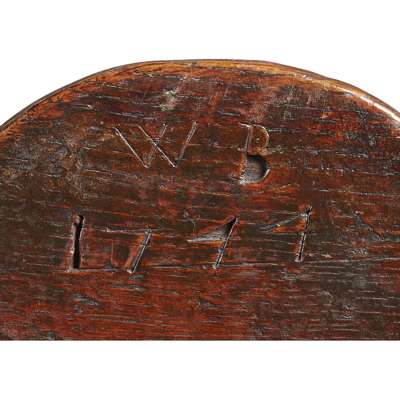the panelled back with scroll cresting above open arms and planked seat, raised on turned and blocked legs linked by stretchers, incised to the rear of the cresting WB/ 1744