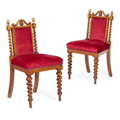 each with upholstered panel back enclosing barley twist uprights, acorn finials and scrolled cresting, raised above upholstered seat on spirally turned front legs (2)