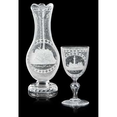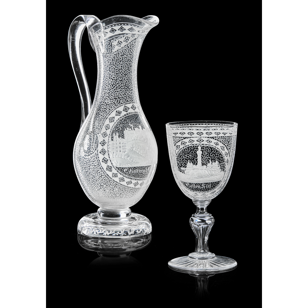 AN ACID ETCHED AND CUT GLASS EWER AND GOBLET BY HOLYROOD GLASS WORKS, EDINBURGH