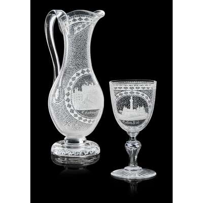 each with scrolled decoration and diamond borders, the ewer etched with a scene depicting Edinburgh Castle and inscribed EDINBURGH CASTLE, the goblet etched with a scene depicting Calton Hill and inscribed CALTON HILL (2)