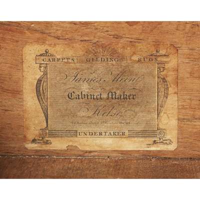 with ebonised decoration, the characteristic stage back above an arrangement of frieze and deep drawers raised on ring turned and tapered legs, bears makers label inside drawer JAMES MEIN/ CABINET MAKER/ KELSO