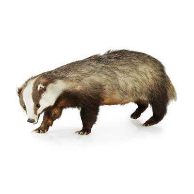 head and neck mount, with inset eyes and eleven points to antlers, on a shield shaped wall mount, width: 89cm(widest point of antlers), width: 60cm (tip to tip); together with a TAXIDERMY BADGER, with open mouth and glass inset eyes, 74cm long (2)