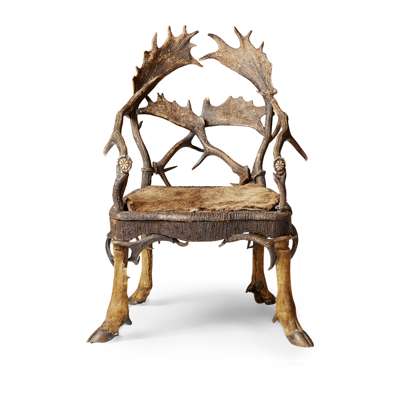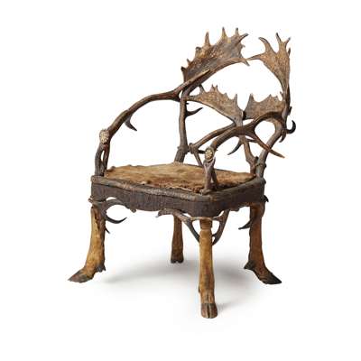with back and legs formed from entwined antlers, with oak framed seat, and close nailed hide-upholstered panel seat
