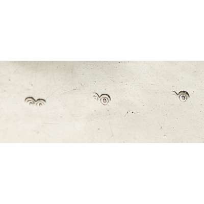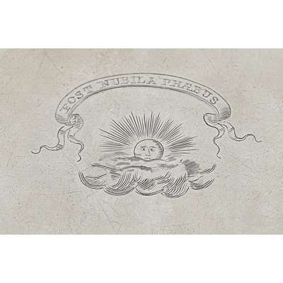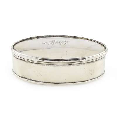 makers marks thrice but indistinct, of oval outline with straight sides and reeded rim, the hinged cover with script initials JMcG, the base with engraved crest and motto