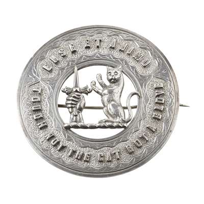 Unmarked, the circular plaid brooch with twin applied crests and mottos