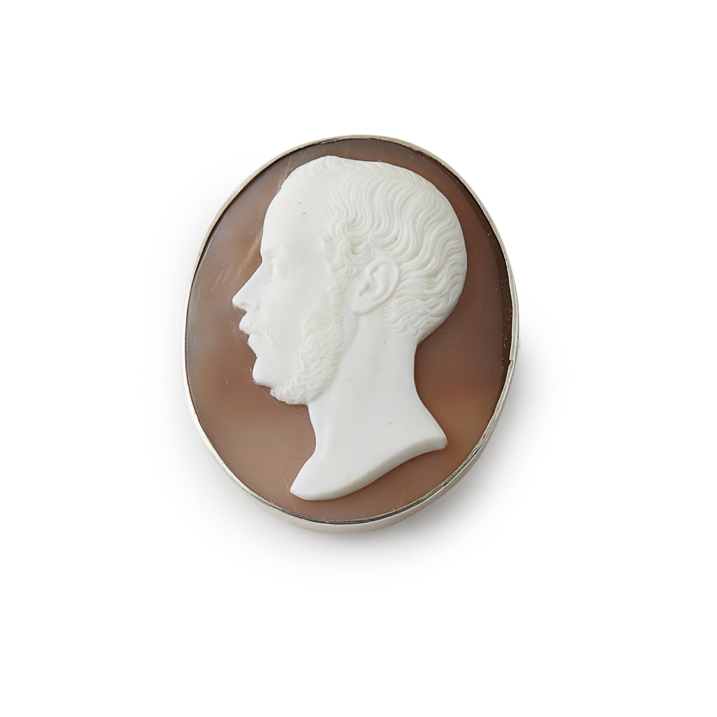The oval carved shell cameo with high relief profile portrait of H.R.H. Prince Albert, in unmarked silver frame with simple hinged pin