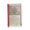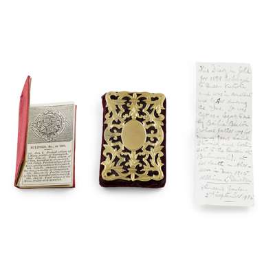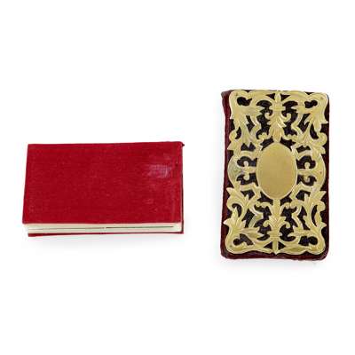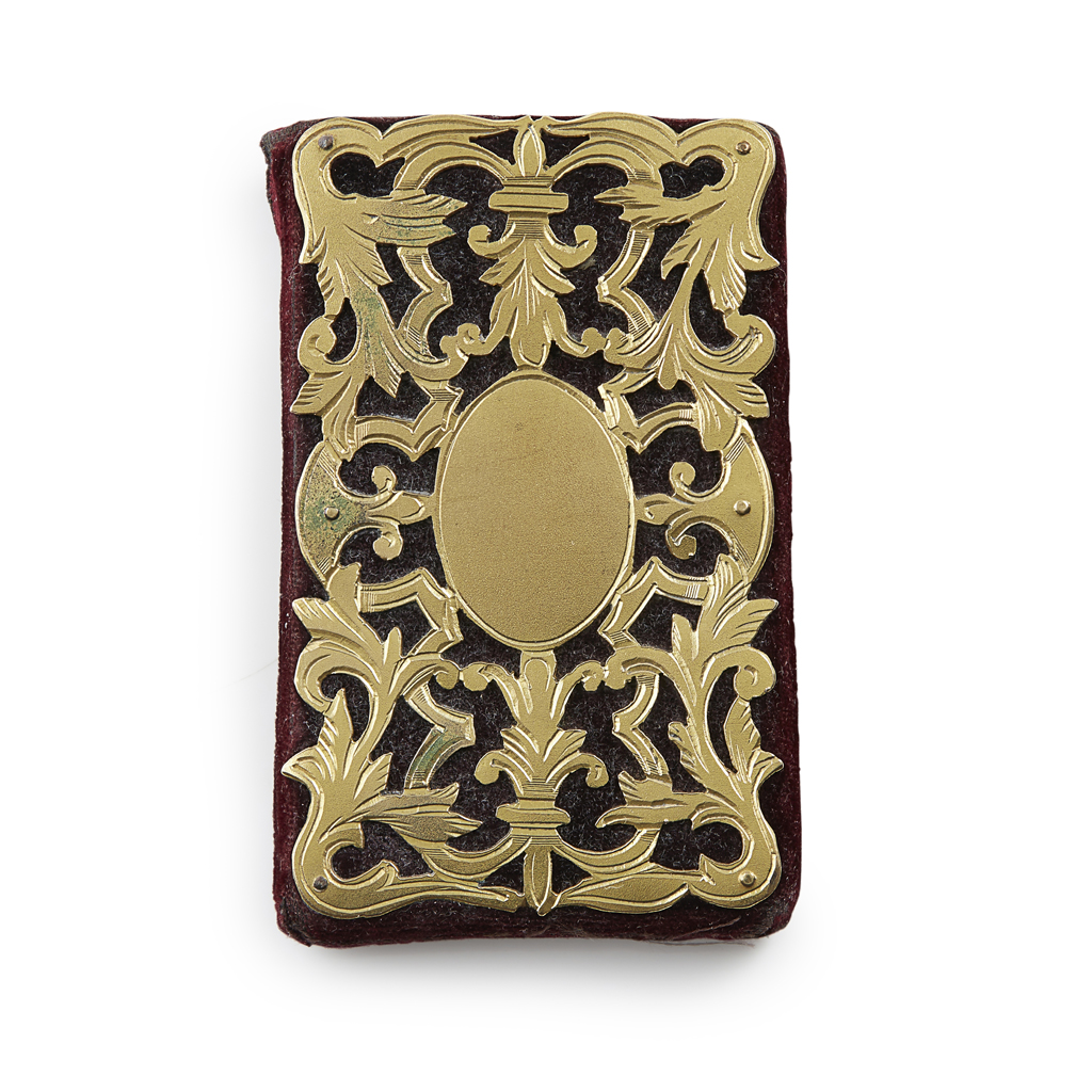 the red velvet case with pierced and engraved floral unmarked yellow metal cover, the pull out almanac printed 1899 with calendar, moon phases, important dates, people etc.