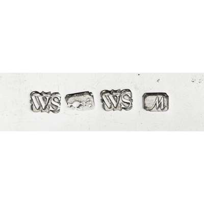 Marked WS, pot of lilies, WS, M, of Celtic Point pattern with crest and motto to terminal