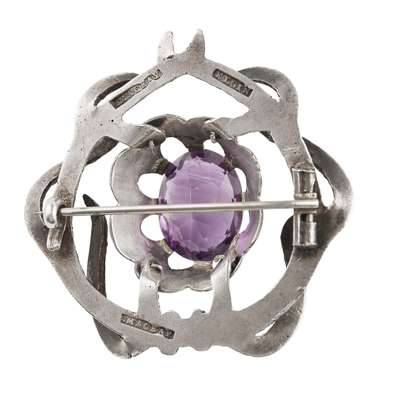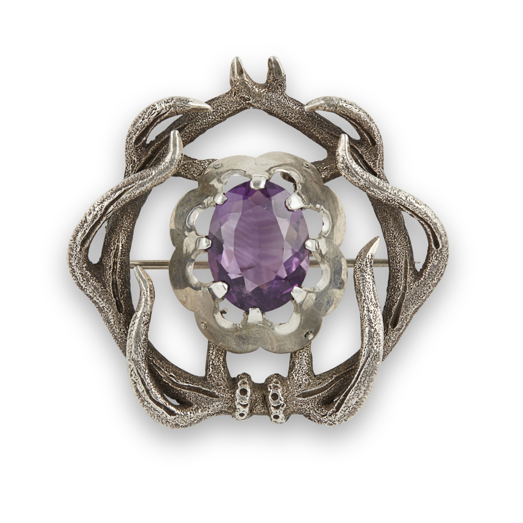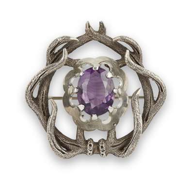 marked MACKAY, ELGIN, MACKAY, the open brooch formed of intertwined stag antlers naturalistically textured supporting a claw set oval amethyst within, with hinged pin to reverse