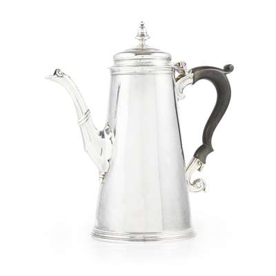 of tapered cylindrical form, stepped cover, turned finial, scroll spout, S scroll wooden handle with thumbpiece