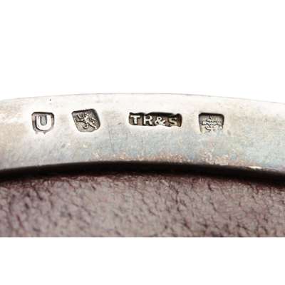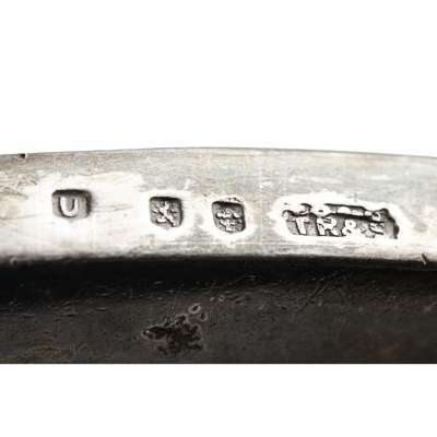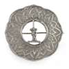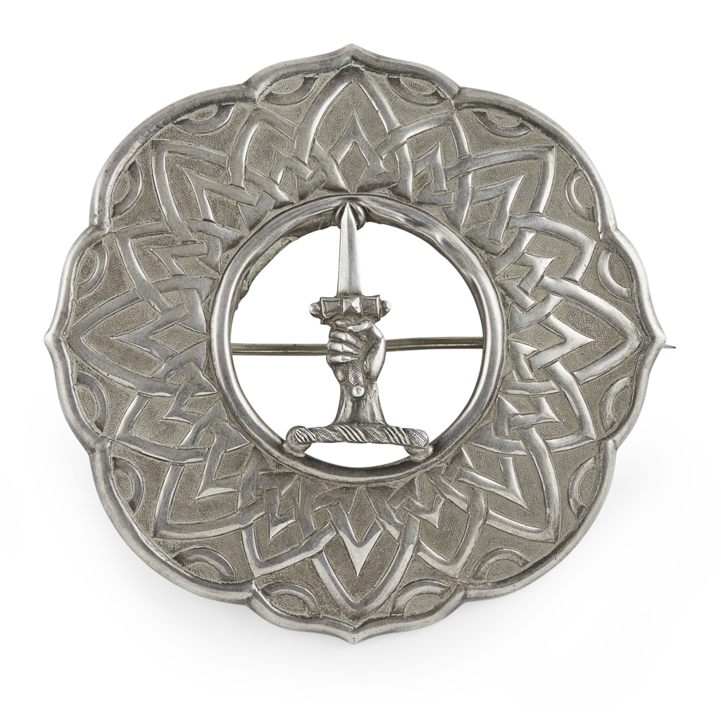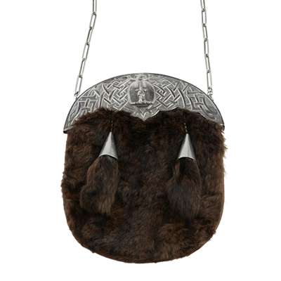 the arched cantle with Celtic knot work with applied crest of a hand holding a dagger, with brown fur body and twin silver capped tassels; together with a matching plaid brooch of annular form with Celtic border and applied crest (2)