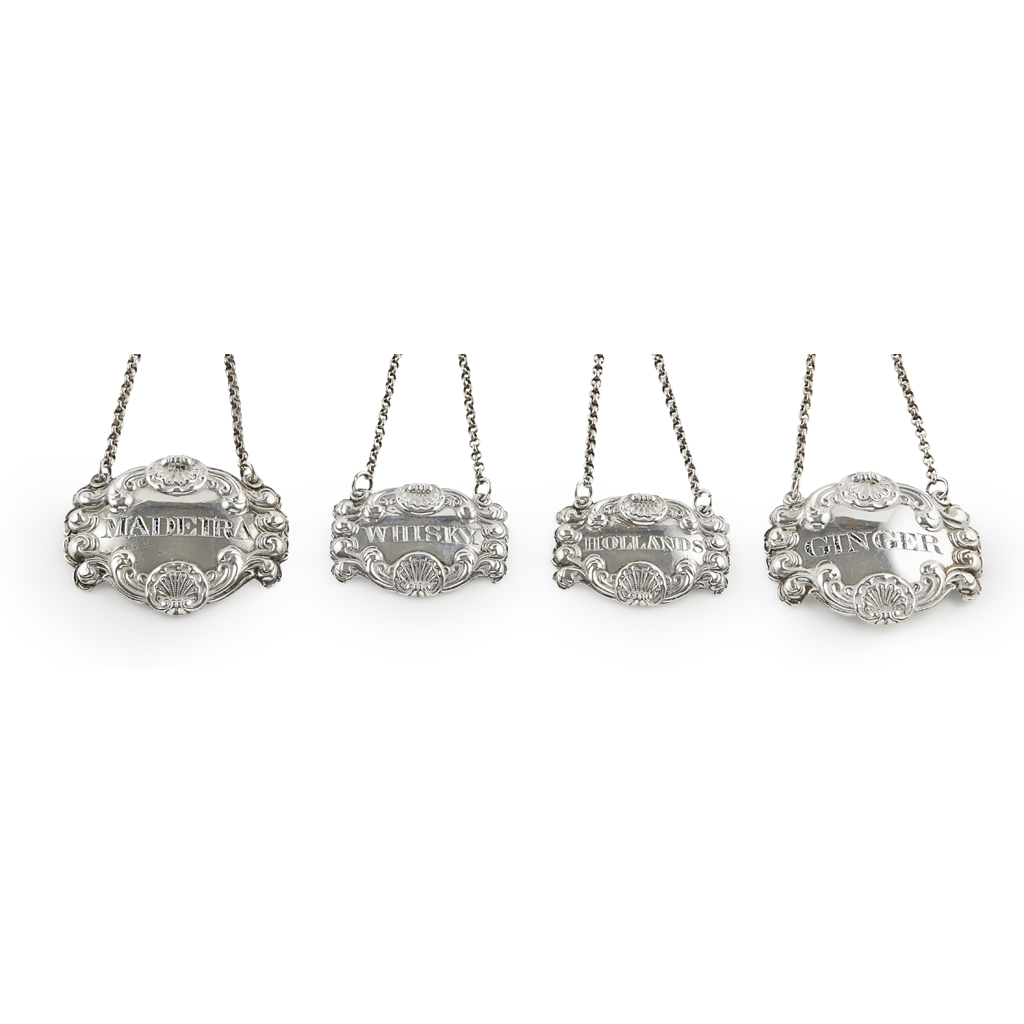 comprising a matched graduated set of two large for MADEIRA and GINGER and a smaller pair for HOLLANDS and WHISKY, with scroll and shell borders suspended from belcher link chains (4)