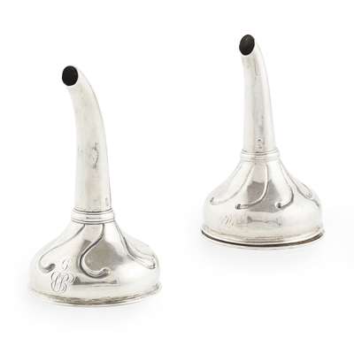 each of conventional form with shallow bowls and curved spouts, with unusual spiral chased decoration and engraved initials