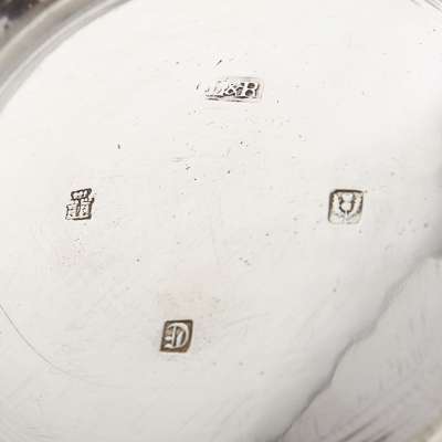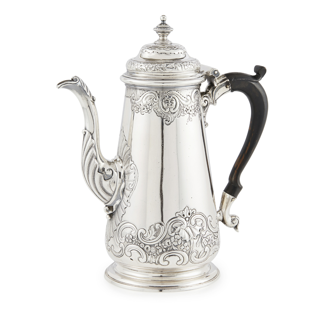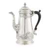 of slight baluster form with chased scroll and foliate pendant borders with masks hidden in cartouches, the S scroll spout with acanthus clasping and chased shell detail to join with body, S scroll wooden handle and domed hinged lid