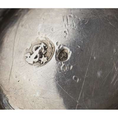 maker's mark in monogram only, of typical form with ten tapered beaded lobes, with reeded girdle and engraved armorial shield above