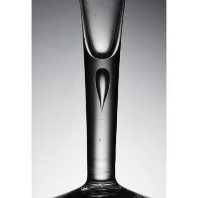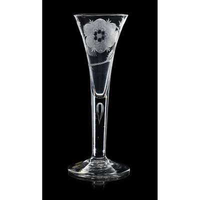 the deep drawn trumpet bowl engraved with displayed rose head flanked by single bud and foliage, raised on a tapered stem with elongated tear drop air bubble raised on a domed circular foot