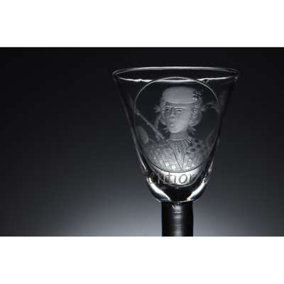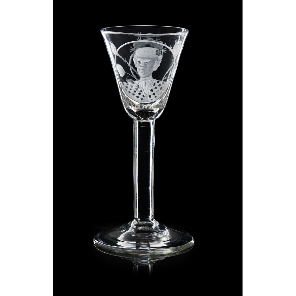 Note: Jacobite wine glasses engraved with such bold and obvious portraits of Prince Charles are a rare survival. Indeed, such an obvious show of support in any form for the Jacobites is unusual. Considered by many the peak of wheel engraved glasses, these must surely have been owned not only by higher ranking supporters but also those more confident in their safety and situation, as owning such pieces would have been considered treason.