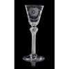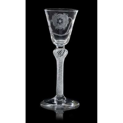 the tapered funnel bowl engraved with displayed rose head flanked by open and closed buds, the reverse with oak leaf and star, raised on a knopped multi air twist stem and domed circular foot