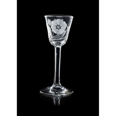 the conical bowl with engraved displayed rose flanked by twin buds and a star behind, raised on a straight plain stem to a domed circular foot