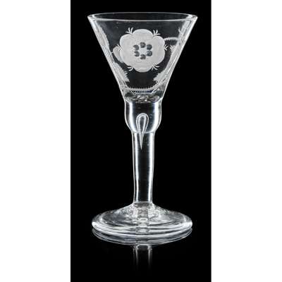 the large drawn trumpet bowl above a knopped stem and folded circular foot, the bowl engraved with open rose head flanked by open and closed buds