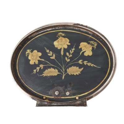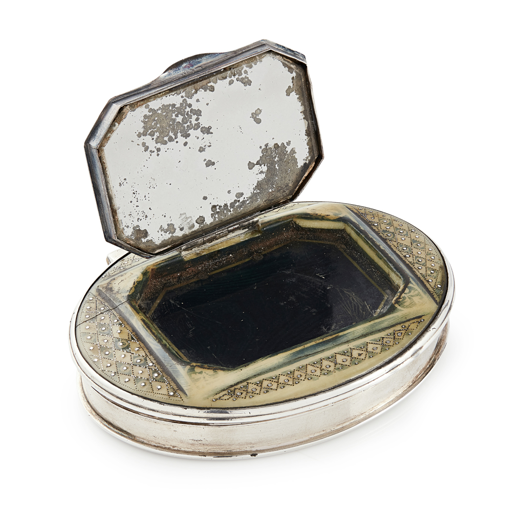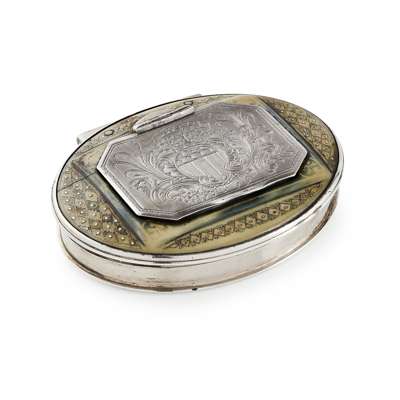 of oval outline, the plain straight sided silver body with reeded rims, the hinged ivory cover with traces of blue staining and inlaid lattice and pins, the centre set with an almost flush hinged silver cover with finely engraved armorial with rococo scroll mantling, when open reveals a mirror to interior and blue stained ivory inner, the inside of the main cover with three displayed open rose heads on a greenish blue background, the base of similar colour with foliate scroll to outside