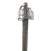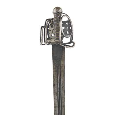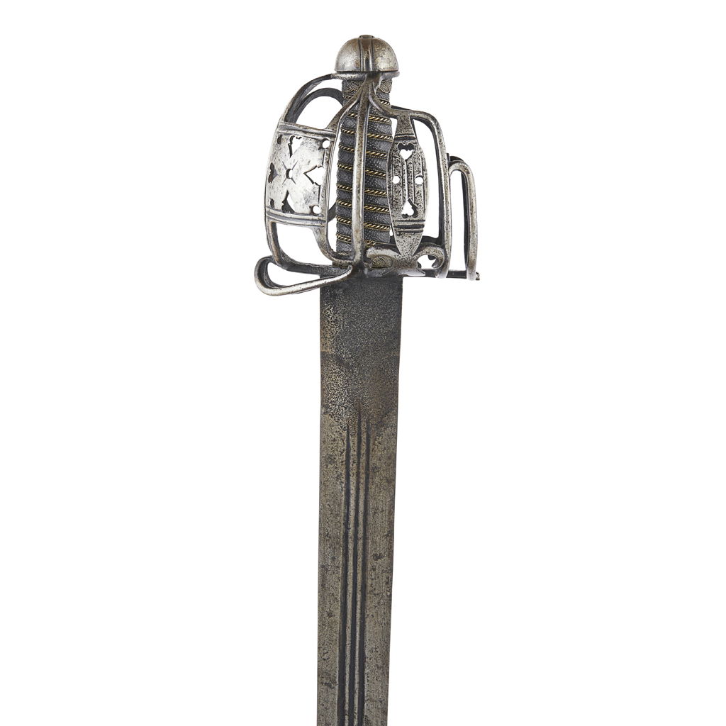 the basket formed of flattened bars with incised lines to guards, with elongated side guards with pierced heart and stars, with horseman's loop and compressed bun pommel, the wooden grip with fish skin and wire bound, the wide blade with triple fullers