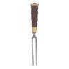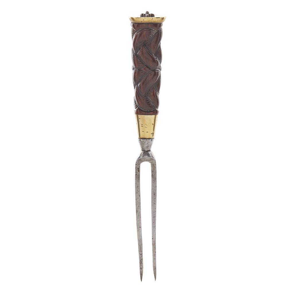 the finely carved wooden handles with interwoven basket weave pattern with simple brass pommel cap with finely cut steel nut, set with brass collar mounts to simple tapered knife blade and two prong fork (2)