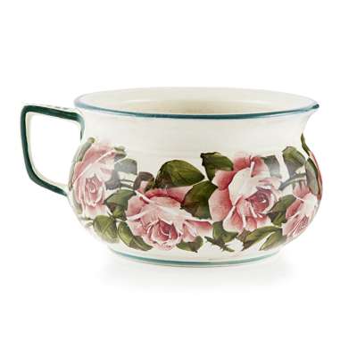comprising a BEAKER VASE, decorated with 'Sweet Peas', 14.5cm high; a SMALL PLATE, decorated with 'Purple Plums', 9.5cm diameter; a MILK JUG, decorated with 'Cabbage Roses', 6.5cm high; a PIN TRAY, decorated with 'Cabbage Roses', 14cm across; and a CHAMBER POT, decorated with 'Cabbage Roses', 22cm across, restored handle, each piece with impressed or painted maker's marks (5)
