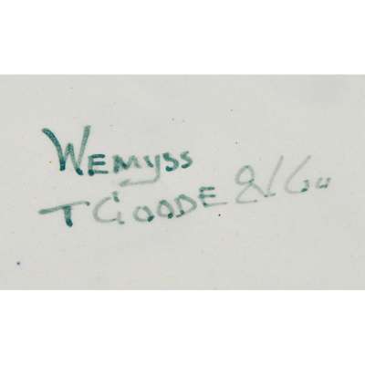 decorated by Edwin Sandland, with associated glass liners, painted and impressed mark WEMYSS, painted retailer's mark T. GOODE & CO.