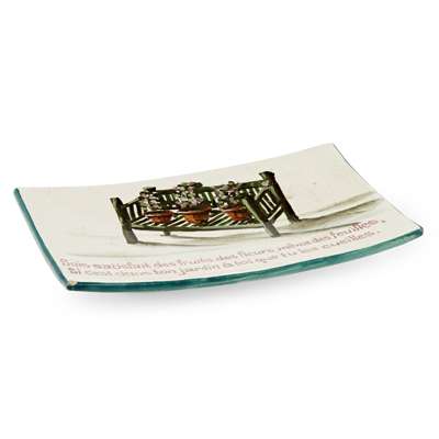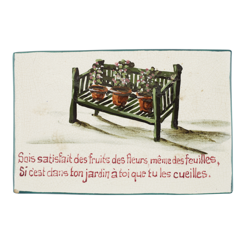 decorated by Karel Nekola, depicting three flower pots on a garden bench, bearing inscription SOIS SATISFAIT DES FRUITS DES FLEURS, MEME DES FEUILLES,/ SI C'EST DANS TON JARDIN A TOI QUE TU LES CUEILLES., painted mark WEMYSS