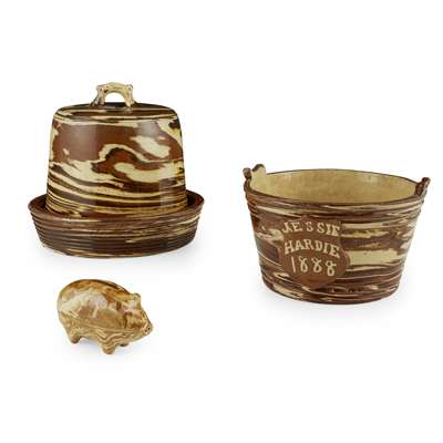 comprising a CHEESE DISH & COVER, 24cm high; a LUGGED BOWL, with inscription JESSIE HARDIE 1888, 22cm diameter; and a SMALL PIG MONEY BANK, 11cm long (3)