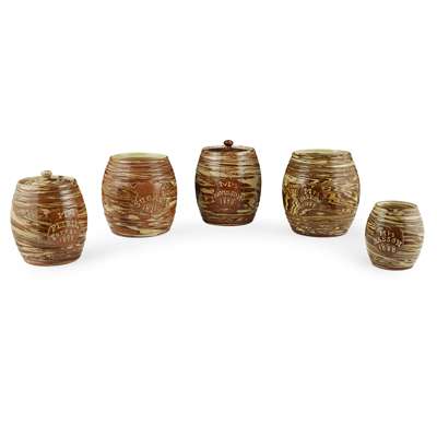 A GROUP OF FIVE SEATON POTTERY STORAGE JARS