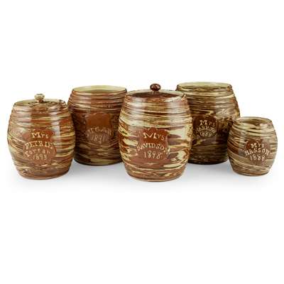 inscribed MRS DAVIDSON 1898, includes cover, 25cm high; MRS HARROW, 1888, cover lacking, 23.5cm high; SUGAR 1891, cover lacking, 22cm high; MRS PETRIE FORFAR 1893, includes cover, 23cm high; and MRS MASSON 1888, cover lacking, 15cm high (5)