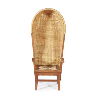 with cowled woven straw back and open arms above a drop-in cord seat on square tapering supports linked by stretchers