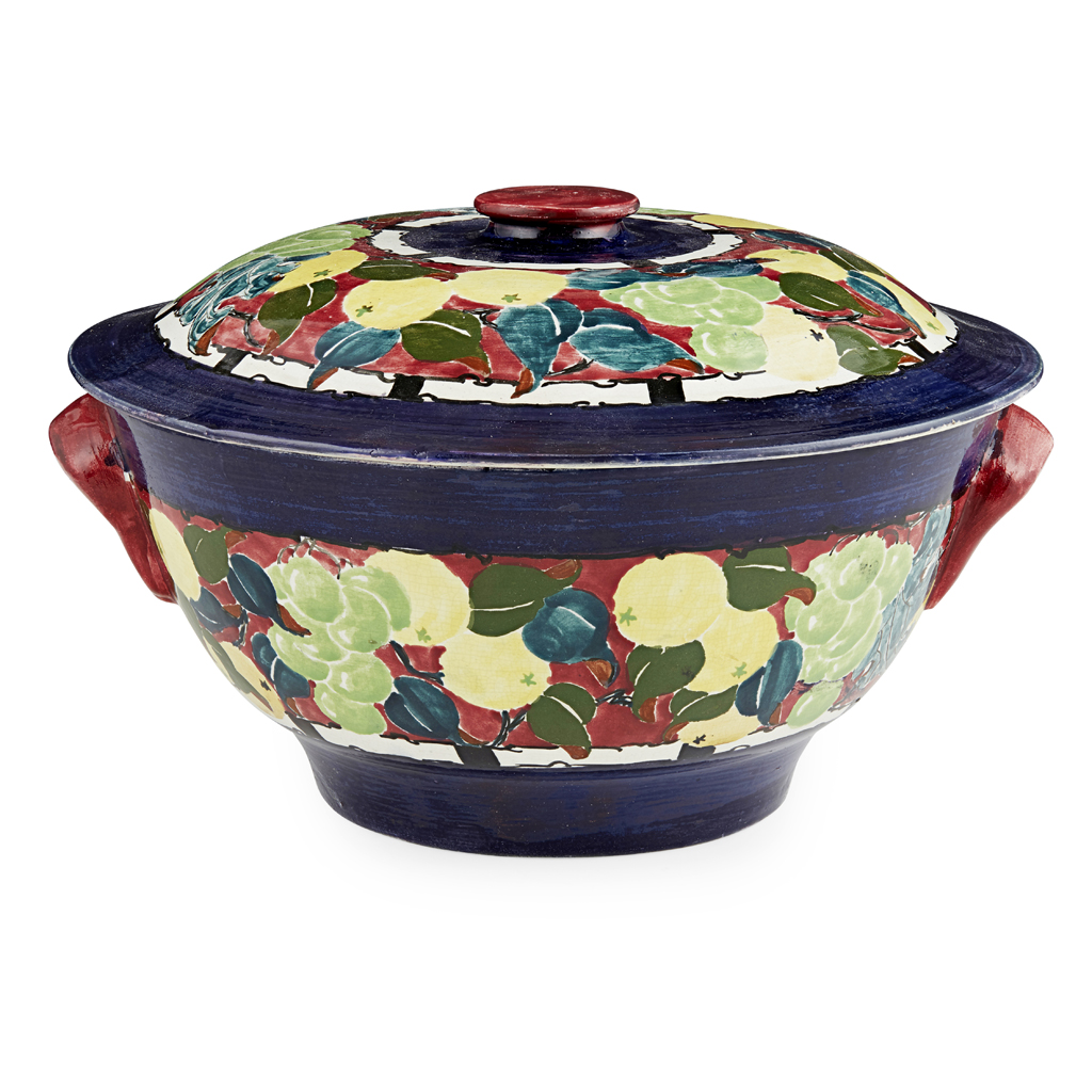 each decorated by Richard Amour with fruits and comprising a LARGE BOWL & COVER, with twin handles, painted maker's marks "BOUGH"/ R.A./ 1925, 28cm across; a MILK JUG, 14.5cm high; and a FRUIT BOWL, 27cm across, each with printed and painted maker's marks (3)
