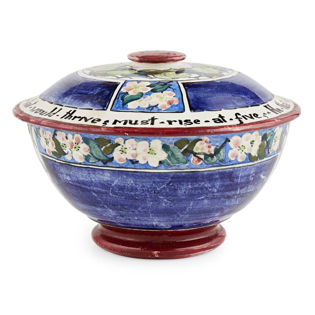 decorated with green apples and dog roses on a blue ground, bearing inscription HE THAT WOULD THRIVE; MUST RISE AT FIVE/ HE THAT HAS THRIVEN; MAY HE TILL SEVEN, with painted marks to bowl and cover MAK' MERRY/ XXII