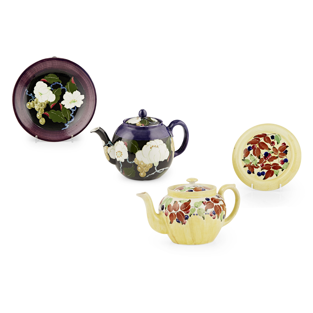 comprising a TEAPOT AND STAND, decorated by Arthur H. Amour, painted marks to each piece BOUGH/ 1924/ A.H.A., teapot 14.5cm high; a TEAPOT, decorated by Richard Amour with Magnolia and grapes, 15cm high; and a MATCHING PLATE, 23cm diameter, painted and printed maker's marks (4)